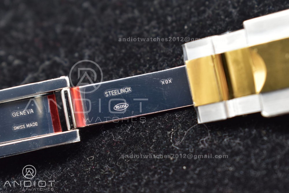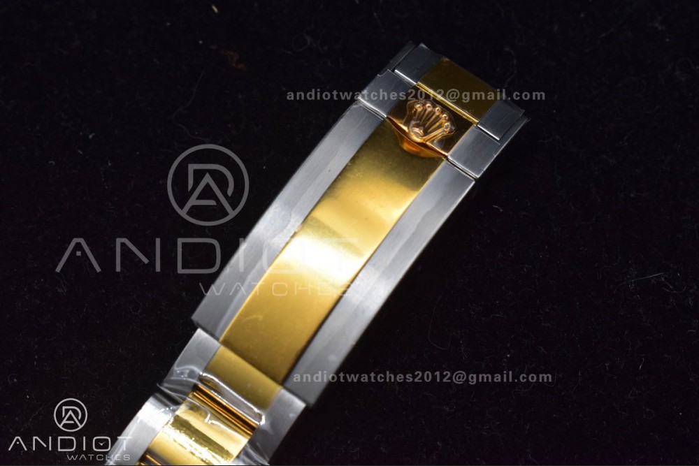 - Strap : 904L stainless steel bracelet with perfect SEL, clasp and divers extension and smooth screws, 18k yellow gold plated middle links