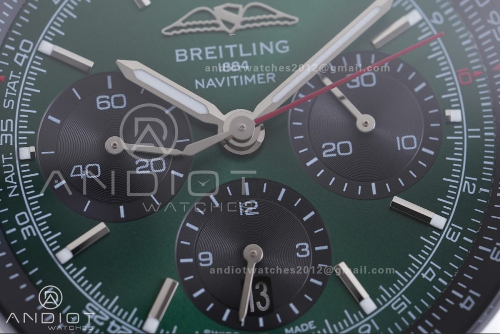 Reviews Over Navitimer B01 SS 43mm BLS 1:1 Best Edition Dark Green Dial Black Subdial on SS Bracelet A7750