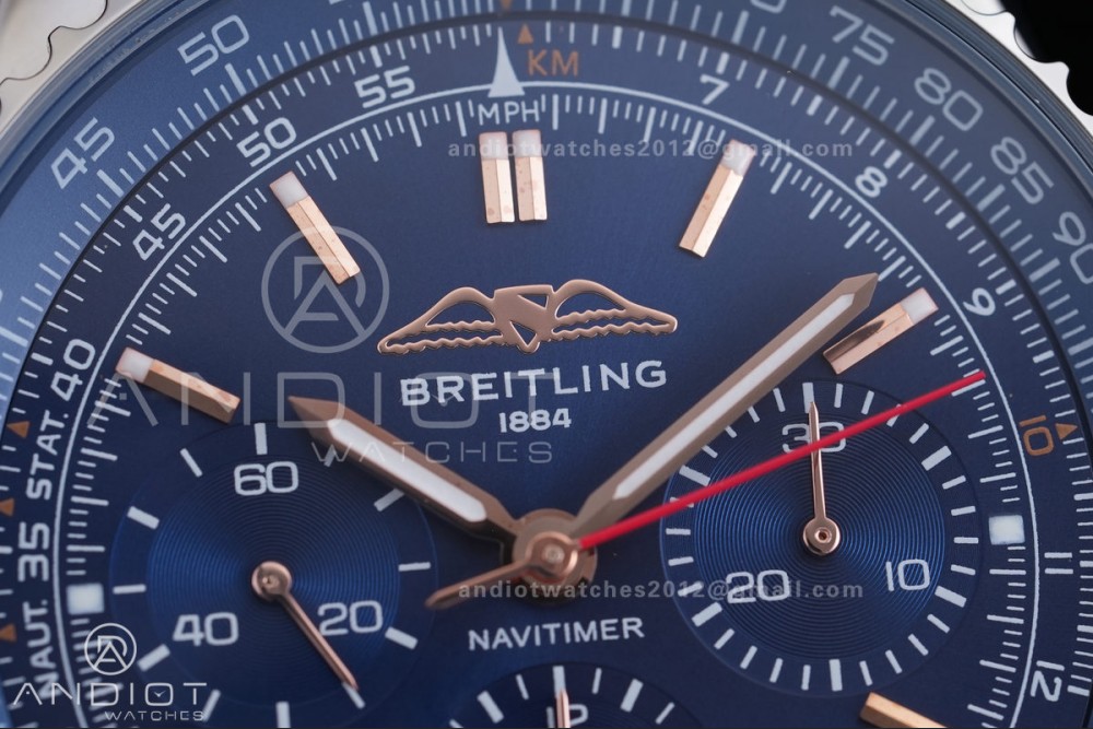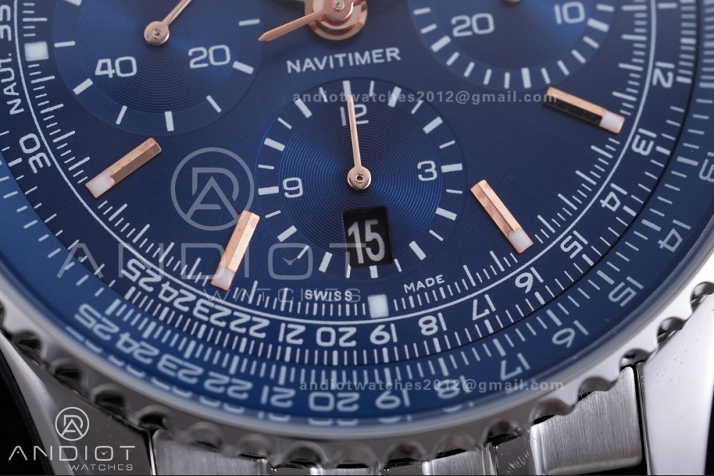 Reviews Over Navitimer B01 SS 43mm BLS 1:1 Best Edition Blue Dial RG Marker on SS Bracelet A7750