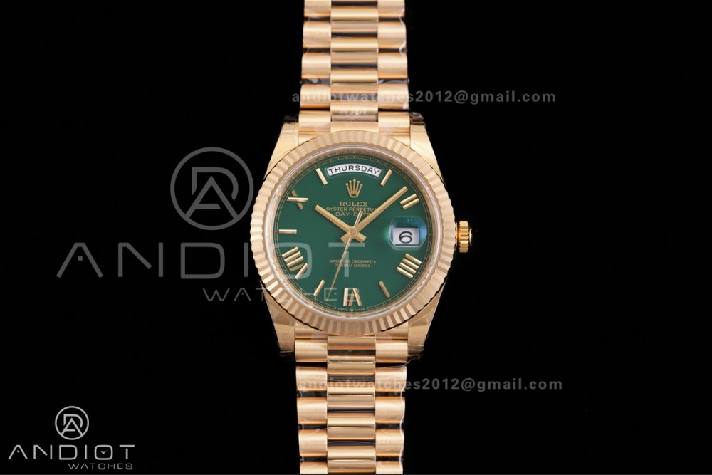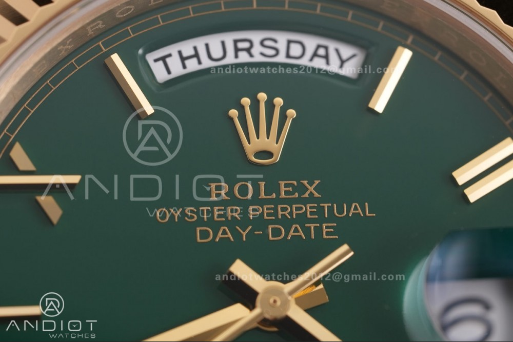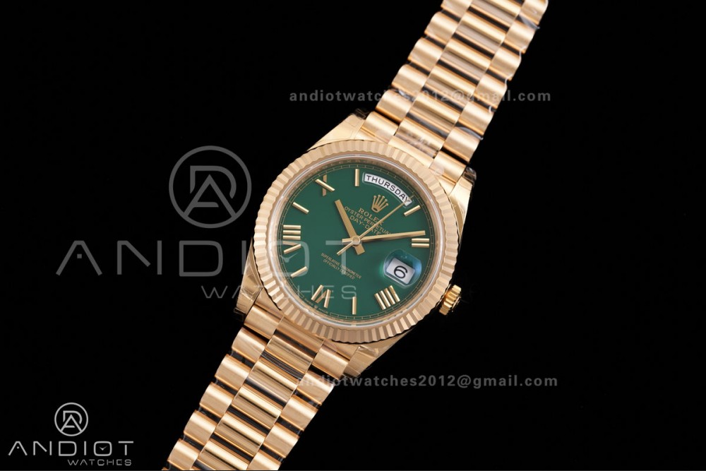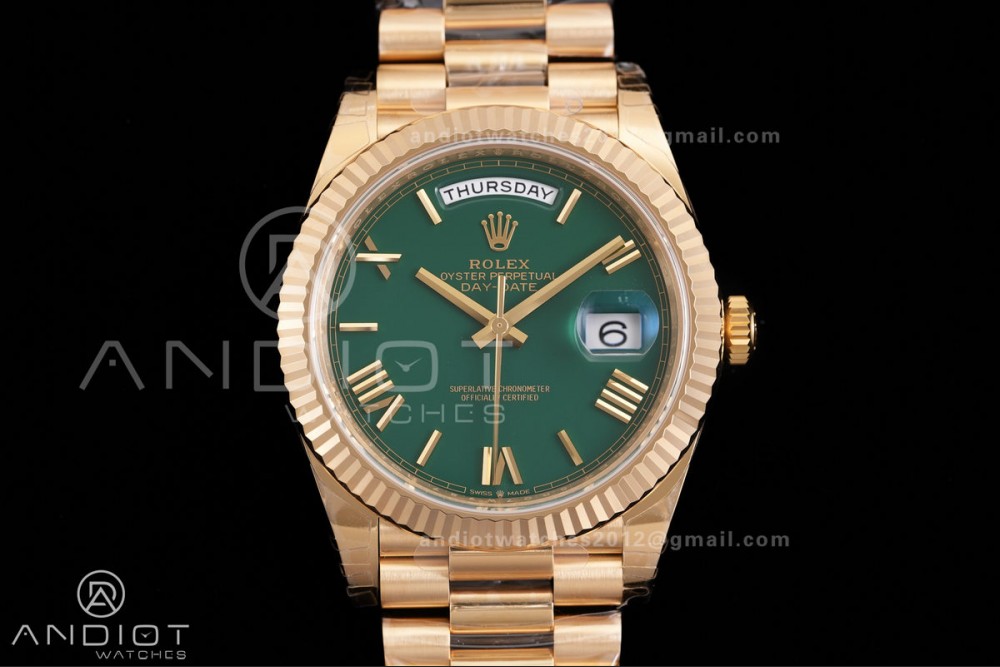 Reviews Over Day Date 228238 40mm 904L YG VSF 1:1 Best Edition Green Dial Roman Marker On YG President Bracelet DD3255