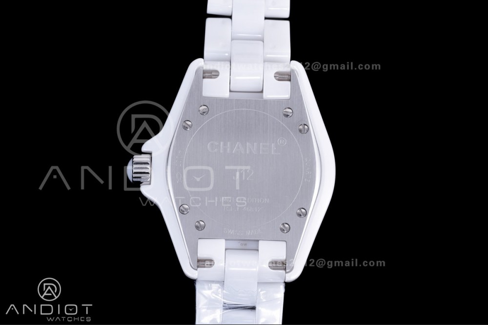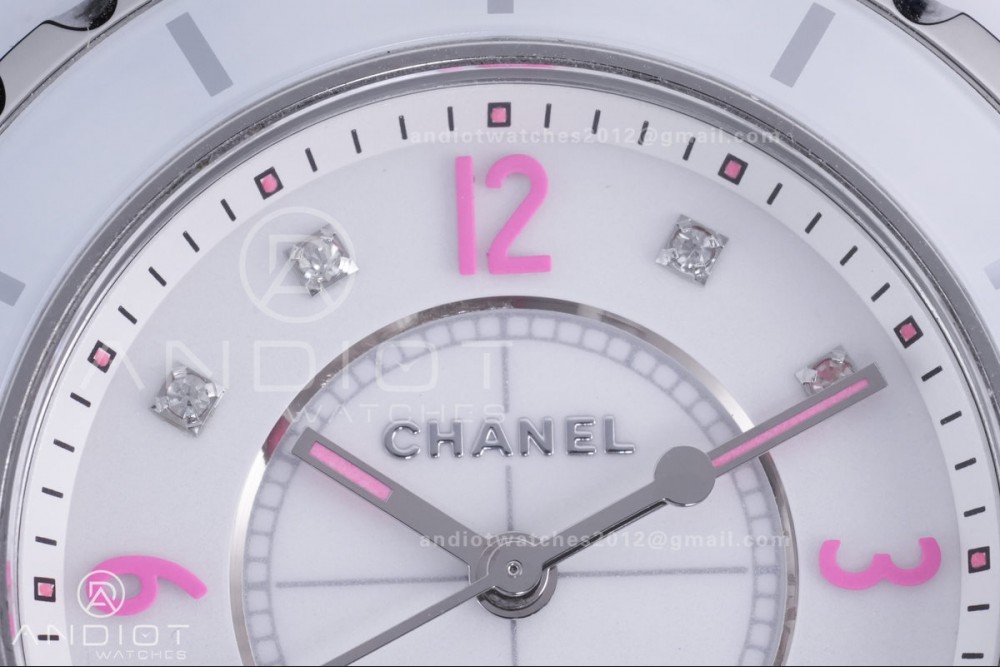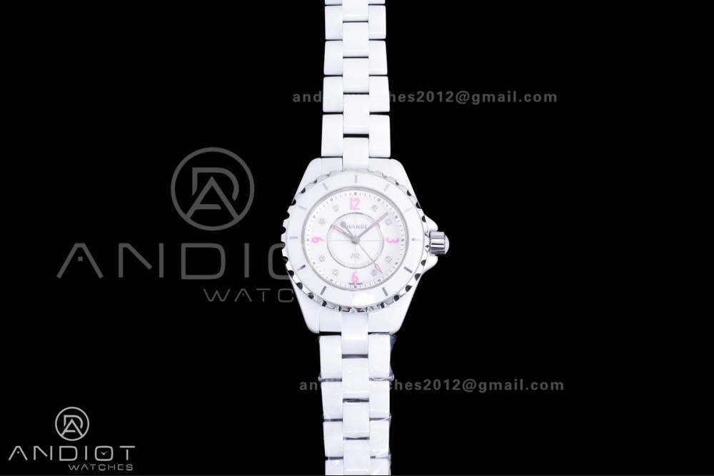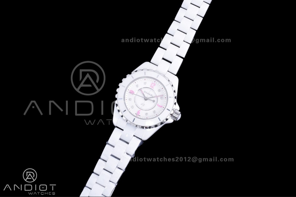 J12 33mm HTF 1:1 Best Edition White Korea Ceramic Cream Dial Pink Markers on Bracelet Swiss Quartz