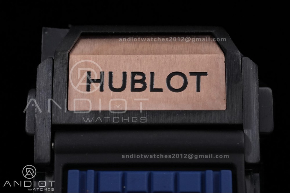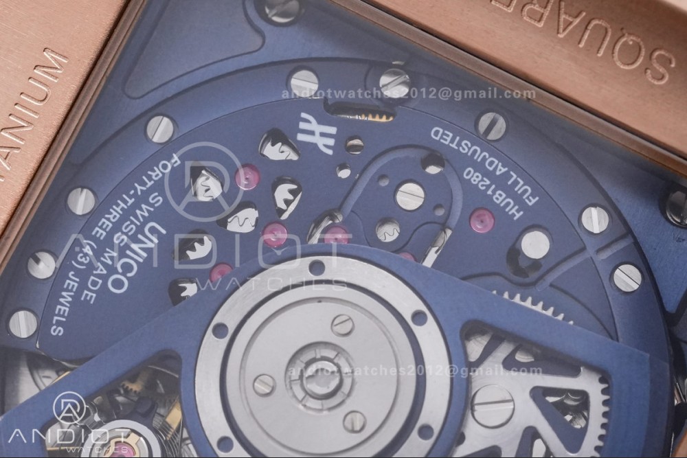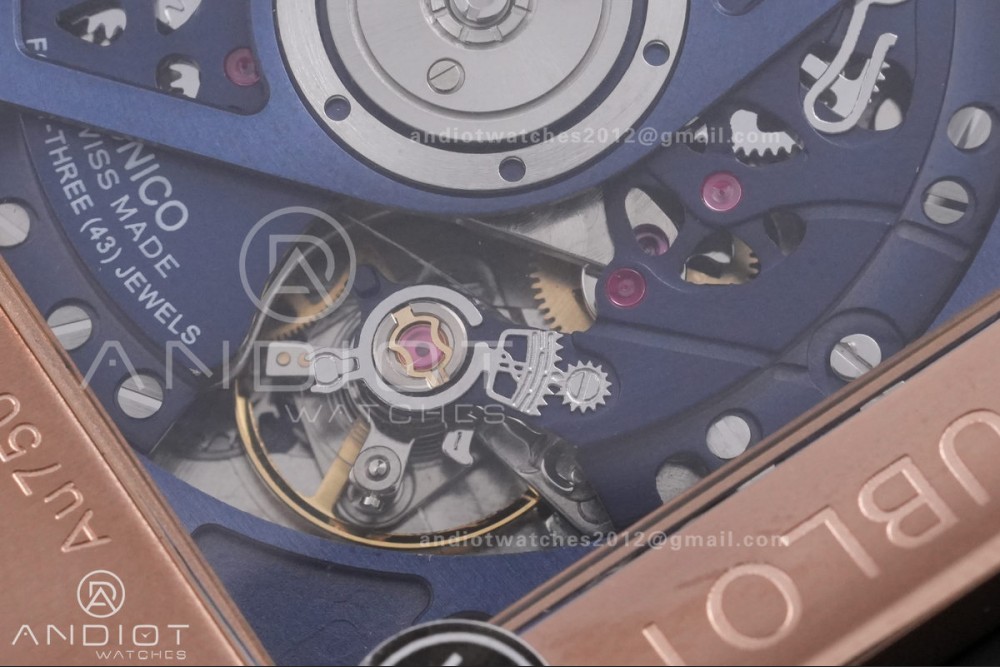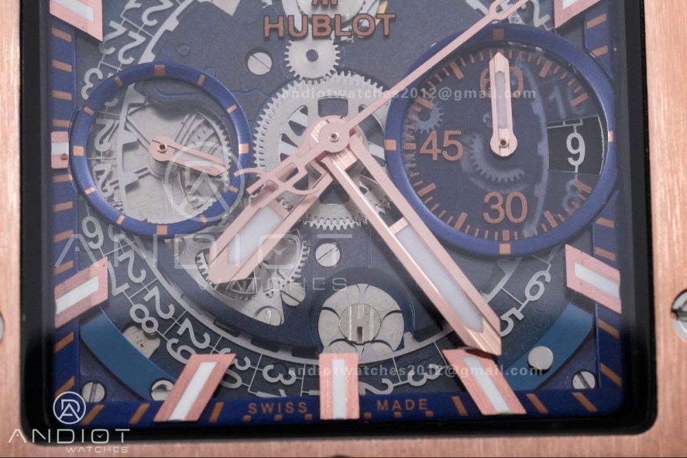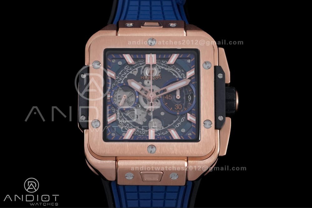 Reviews Over Square Bang Unico 42mm RG BBF 1:1 Best Edition Blue Skeleton Dial on Blue Rubber Strap A1280