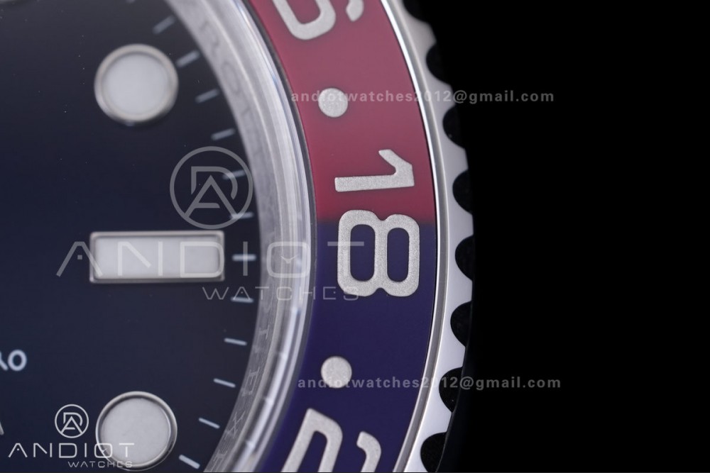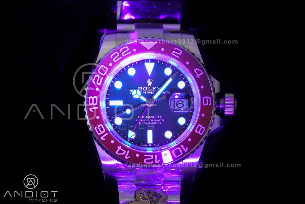 - Bezel : Bi-directional rotating blue/red ceramic bezel(The bezel radiates an all-red color under UV light, uncovering the red undertone beneath the blue as the genuine technology)
